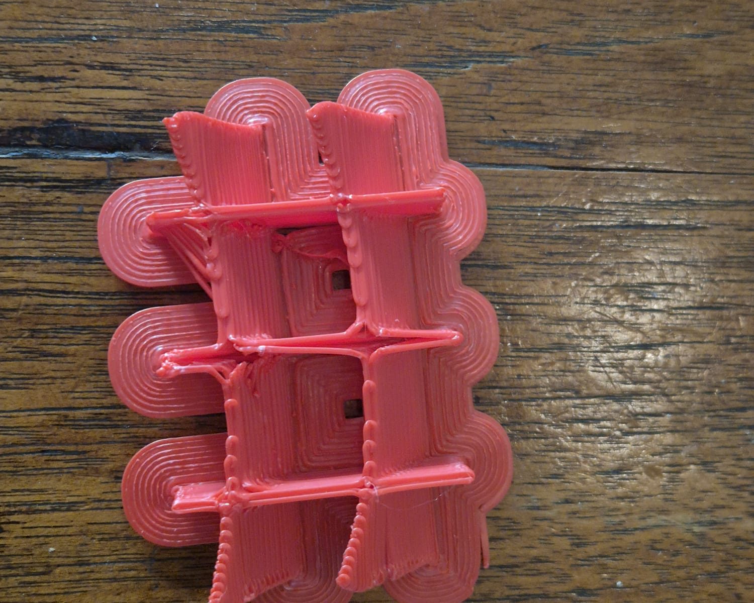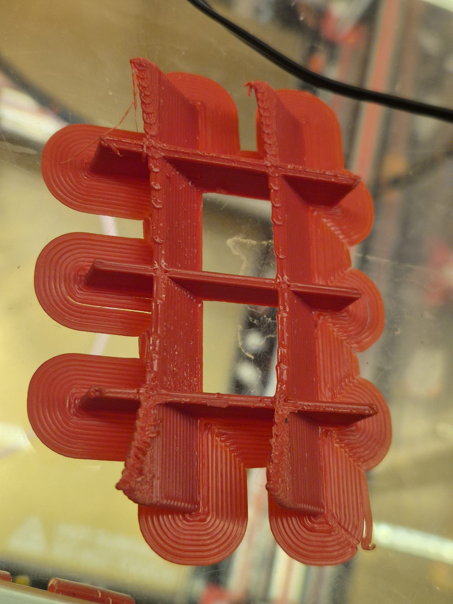 Dit is het moeilijkst te printen matte rode ABS (op de spoel) en vereist een zeer hoge printtemperatuur. Het kan geen enkel percentage objectventilator aan. De prints komen er mat uit wanneer ze onder 270 graden worden geprint en bij 285 graden zijn ze glanzend. Dit type ABS is zeer gevoelig voor kromtrekken. Dit is waarschijnlijk een type ABS zonder toevoegingen.