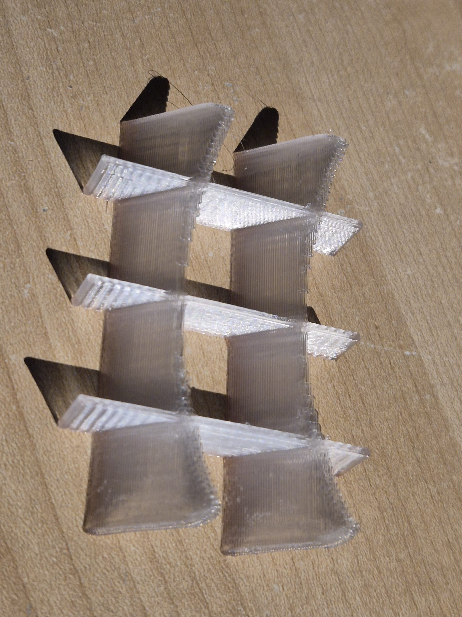 Als de print uit elkaar valt wanneer u deze met weinig kracht probeert te breken, zoals op de bovenstaande afbeelding, is de printtemperatuur te laag. Hetzelfde geldt voor de vleugels van het teststuk als voor de hechting van de lagen.