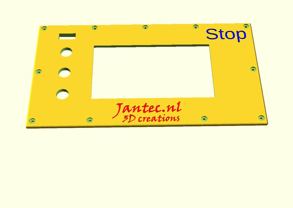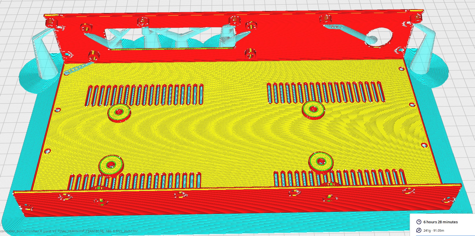 Ik print gereedschap en behuizingen altijd in ABS op 260-270 graden, 100% fan en 100% infill. Het voorpaneel heb ik ook geprint met 100% infill. Gebruik minimale support voor deze onderdelen, maar altijd maximale hechting! Ik heb ook ironing aan staan, zodat alles netjes past en er goed uitziet.
