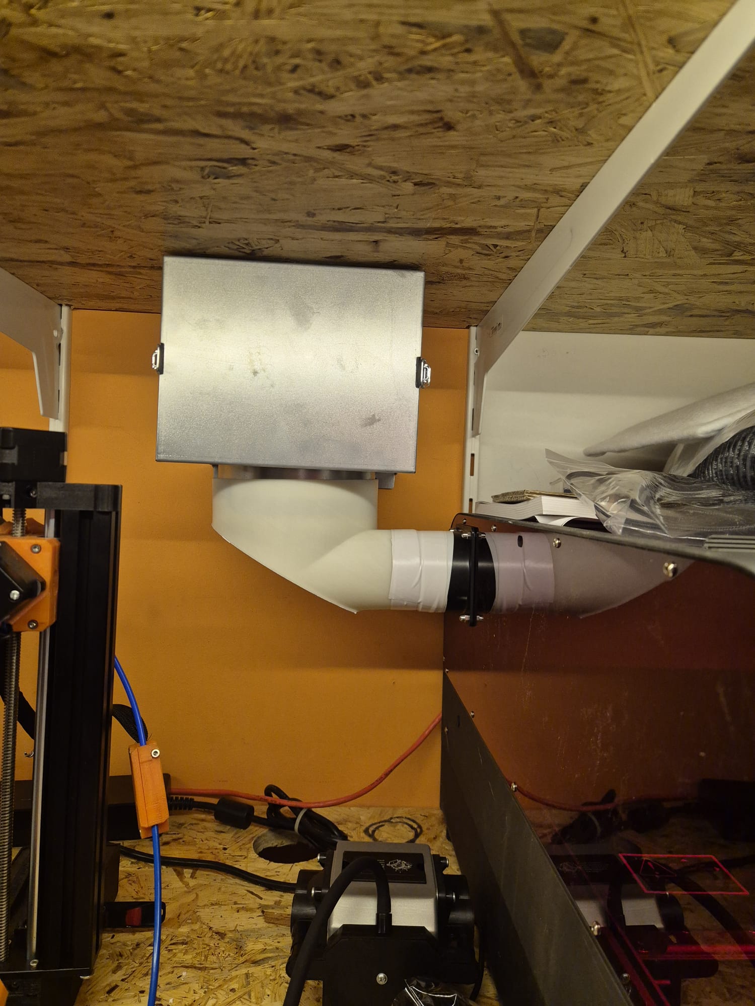 Vooral met acryl en andere kunststoffen is dat wel nodig. De 10×6 cm afvoerbuis gaat van de werkkamer op de eerste verdieping door de muur en via het trapgat naar de tweede verdieping en dan een stukje door het huis naar het stookhok en dan naar de voormalige afvoer van de CV ketel. Die CV ketel gebruik ik niet meer vanwege de warmtepomp.
