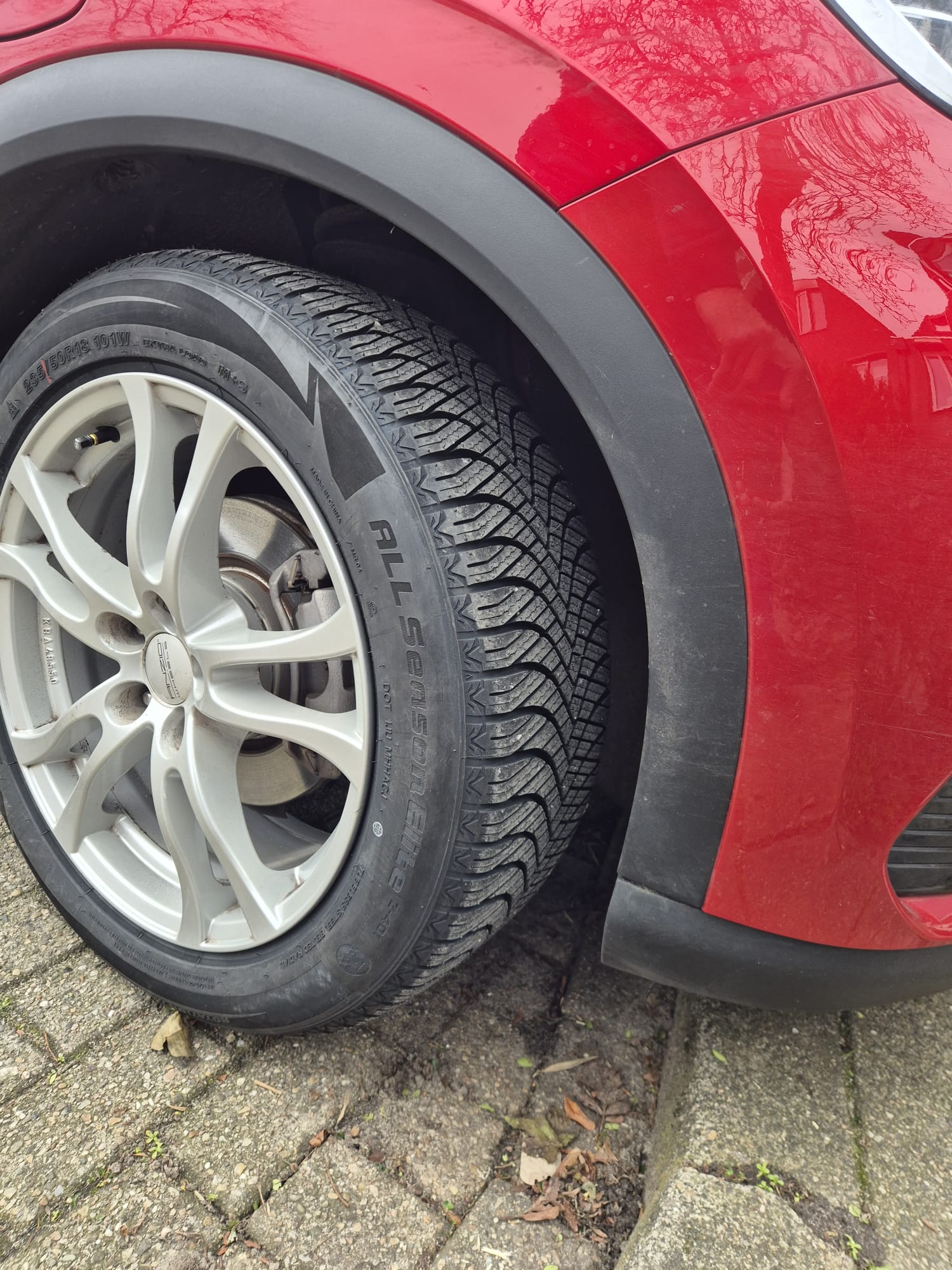 Na het monteren van de luchtregelaars en de vernevelaar voor de luchtapparatuur heb ik mijn winter/ all-weatherbanden voor de Atto3 gemonteerd op de via marktplaats gescoorde LM velgen met veel te grote banden (voor een Mazda CX9) er nog omheen. Eerst even die grote banden die op de velgen zaten (zie foto boven) eraf, tpms sensors monteren en de nieuwe banden eromheen! Balanceren en net op de valreep toch nog deze winter met M&S banden op pad!